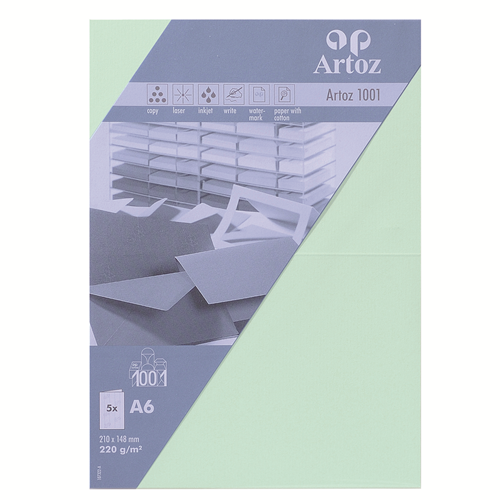Entdecke die faszinierende Welt des 1001 Papiers von Artoz mit einer großen Farb- und Formatauswahl. Die einzigartige Haptik dank Rippung verleiht deinen Projekten eine besondere Note. Ob für stilvolle Einladungen, private Korrespondenz oder kreative saisonale Karten – das 1001 Papier erfüllt all deine gestalterischen Wünsche und lässt sie in zeitloser Schönheit erstrahlen. - Karton 220g/m² - Format: A6, Karte hochdoppelt, mit Falzrille - Set mit 5 Stück im Cellophan Beutel - 210 × 148mm - FSC®- Zertifiziert
