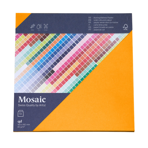 Erlebe die künstlerische Vielfalt des Mosaic Papiers von Artoz und lass deine Projekte in einem faszinierenden Mustermeer erstrahlen. Mit seiner großen Farb- und Formatauswahl ist es ideal für den Druck, perfekt zum Stanzen und Stempeln sowie für Origami und andere Falztechniken – für unendliche Gestaltungsmöglichkeiten und beeindruckende Kreationen. - Papier 90g/m² - Format: quadratisch, Umschlag, ungefüttert - Gerade Klappe mit Haftklebestreifen - Set mit 5 Stück im Cellophan Beutel - 160 × 160mm - FSC®- Zertifiziert