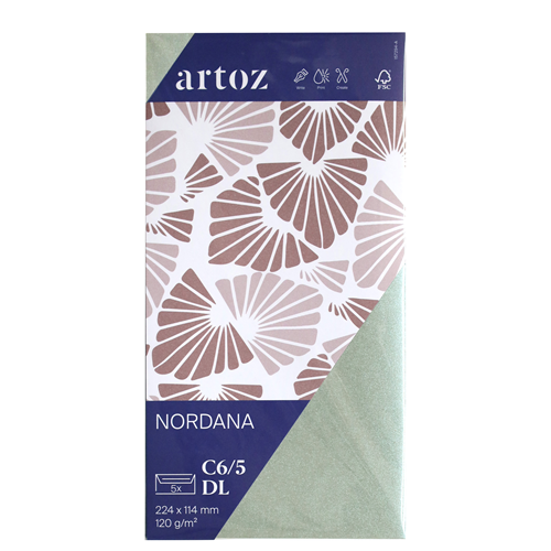 Willkommen in der nordischen Eleganz mit dem Nordana Papier von Artoz. Seine sanften Farbtöne mit leichtem Glanz verleihen deinen Projekten eine zeitlose Schönheit. Das Nordana Papier eignet sich perfekt Gestalten von Einladungen zu festlichen Anlässen, stilvolle Weihnachtskarten und besondere Geschenkgutscheine – für bleibende Erinnerungen voller nordischer Eleganz. - Papier 120g/m² - Format: C6/5, Umschlag, ungefüttert - Set mit 5 Stück im Cellophan Beutel - Gerade Klappe mit Haftklebestreifen - 224 × 114mm - FSC®- Zertifiziert