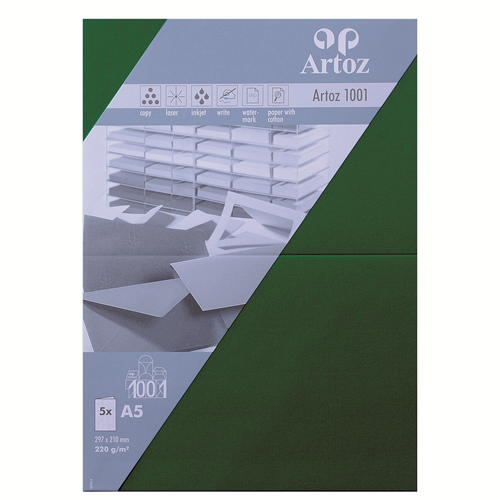 Découvrez le monde fascinant du papier Artoz 1001 disponible dans de très nombreux formats et coloris. Le toucher unique de ce papier nervuré apporte de l’originalité à vos projets. Invitations élégantes, correspondance privée ou cartes de vœux insolites: le charme atemporel du papier 1001 répond à toutes vos envies et fait resplendir vos créations. - Carton 220 g/m² - Format: A5, carte double verticale, avec rainure de pliage - Set de 5 pièces sous cellophane - 297 × 210 mm - Certifié FSC®