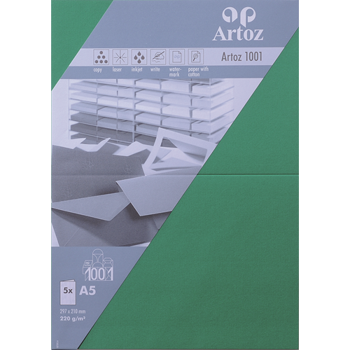 Découvrez le monde fascinant du papier Artoz 1001 disponible dans de très nombreux formats et coloris. Le toucher unique de ce papier nervuré apporte de l’originalité à vos projets. Invitations élégantes, correspondance privée ou cartes de vœux insolites: le charme atemporel du papier 1001 répond à toutes vos envies et fait resplendir vos créations. - Carton 220 g/m² - Format: A5, carte double verticale, avec rainure de pliage - Set de 5 pièces sous cellophane - 297 × 210 mm - Certifié FSC®