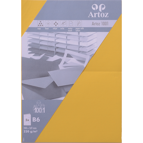 Découvrez le monde fascinant du papier Artoz 1001 disponible dans de très nombreux formats et coloris. Le toucher unique de ce papier nervuré apporte de l’originalité à vos projets. Invitations élégantes, correspondance privée ou cartes de vœux insolites: le charme atemporel du papier 1001 répond à toutes vos envies et fait resplendir vos créations. - Carton 220 g/m² - Format: B6, carte double verticale, avec rainure de pliage - Set de 5 pièces sous cellophane - 240 × 169 mm - Certifié FSC®