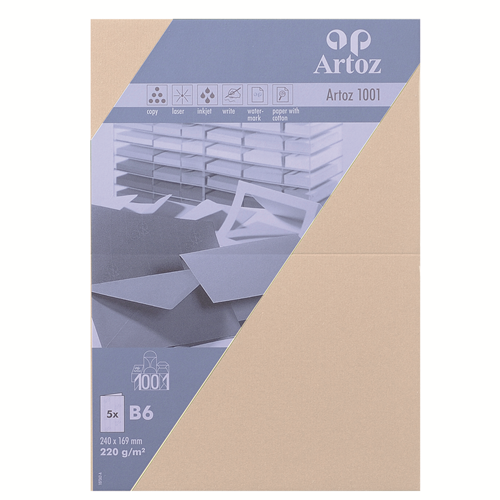 Découvrez le monde fascinant du papier Artoz 1001 disponible dans de très nombreux formats et coloris. Le toucher unique de ce papier nervuré apporte de l’originalité à vos projets. Invitations élégantes, correspondance privée ou cartes de vœux insolites: le charme atemporel du papier 1001 répond à toutes vos envies et fait resplendir vos créations. - Carton 220 g/m² - Format: B6, carte double verticale, avec rainure de pliage - Set de 5 pièces sous cellophane - 240 × 169 mm - Certifié FSC®
