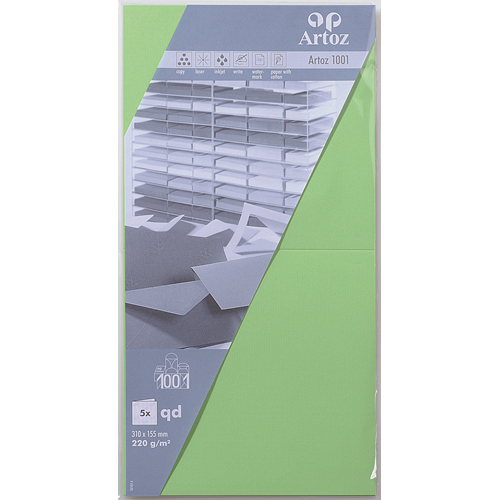 Découvrez le monde fascinant du papier Artoz 1001 disponible dans de très nombreux formats et coloris. Le toucher unique de ce papier nervuré apporte de l’originalité à vos projets. Invitations élégantes, correspondance privée ou cartes de vœux insolites: le charme atemporel du papier 1001 répond à toutes vos envies et fait resplendir vos créations. - Carton 220 g/m² - Format: carré, carte avec rainure de pliage - Set de 5 pièces sous cellophane - 310 × 155 mm - Certifié FSC®
