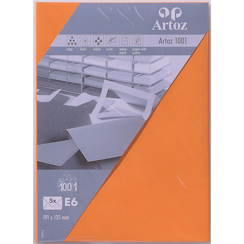 Découvrez le monde fascinant du papier Artoz 1001 disponible dans de très nombreux formats et coloris. Le toucher unique de ce papier nervuré apporte de l’originalité à vos projets. Invitations élégantes, correspondance privée ou cartes de vœux insolites: le charme atemporel du papier 1001 répond à toutes vos envies et fait resplendir vos créations. - Papier 100 g/m² - Format: E6, enveloppe, non doublée - Set de 5 pièces sous cellophane - Rabat pointu gommé - 191 × 135 mm - Certifié FSC®