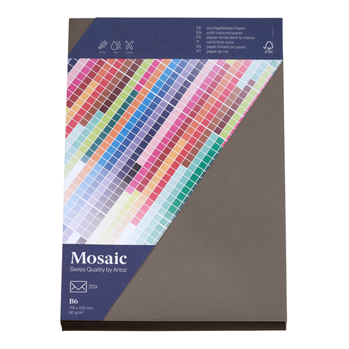 Découvrez la polyvalence infinie du papier Artoz Mosaic. Ses innombrables motifs feront resplendir vos projets! Disponible dans une vaste palette de teintes et de formats, il peut parfaitement être imprimé, tamponné, perforé ou plié, vous offrant ainsi une foule de possibilités créatives plus impressionnantes les unes que les autres.