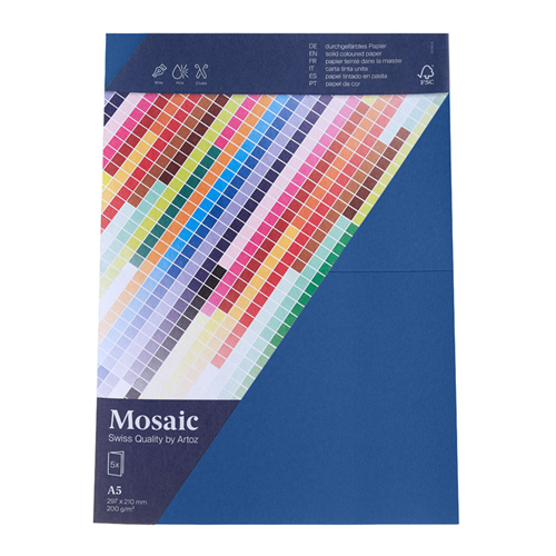 Découvrez la polyvalence infinie du papier Artoz Mosaic. Ses innombrables motifs feront resplendir vos projets! Disponible dans une vaste palette de teintes et de formats, il peut parfaitement être imprimé, tamponné, perforé ou plié, vous offrant ainsi une foule de possibilités créatives plus impressionnantes les unes que les autres. - Carton 200 g/m² - Format: A5, carte double verticale, avec rainure de pliage - Set de 5 pièces sous cellophane - 297 × 210 mm - Certifié FSC®