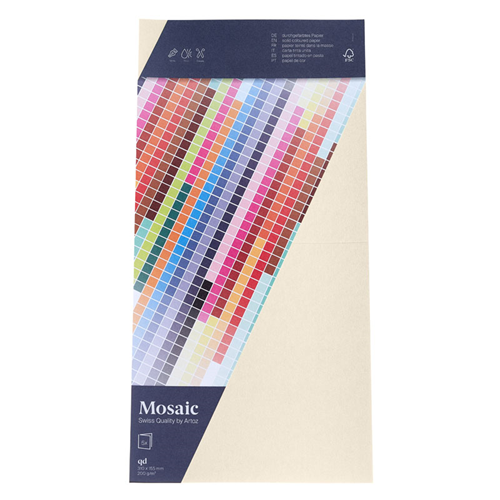 Découvrez la polyvalence infinie du papier Artoz Mosaic. Ses innombrables motifs feront resplendir vos projets! Disponible dans une vaste palette de teintes et de formats, il peut parfaitement être imprimé, tamponné, perforé ou plié, vous offrant ainsi une foule de possibilités créatives plus impressionnantes les unes que les autres. - Carton 200 g/m² - Format: carré, carte avec rainure de pliage - Set de 5 pièces sous cellophane - 310 × 155 mm - Certifié FSC®