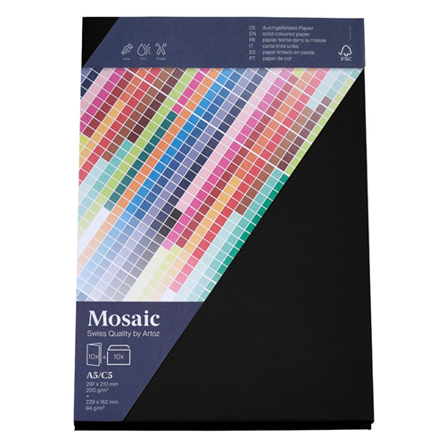 Découvrez la polyvalence infinie du papier Artoz Mosaic. Ses innombrables motifs feront resplendir vos projets! Disponible dans une vaste palette de teintes et de formats, il peut parfaitement être imprimé, tamponné, perforé ou plié, vous offrant ainsi une foule de possibilités créatives plus impressionnantes les unes que les autres.