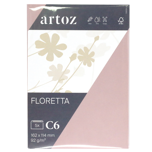 Plongez dans l’univers délicieusement frais du papier Artoz Floretta et laissez votre créativité s’exprimer. Avec ses délicates couleurs florales tendance, il est parfait pour réaliser des créations modernes. Écrits, impressions, projets créatifs ou calligraphies, le papier Floretta vous invite à déployer la splendeur de vos idées et à créer des œuvres-d’art inoubliables. - Papier 92 g/m² - Format: C6, enveloppe, non doublée - Set de 5 pièces sous cellophane - Rabat droit avec bande adhésive - 162 × 114 mm - Certifié FSC®