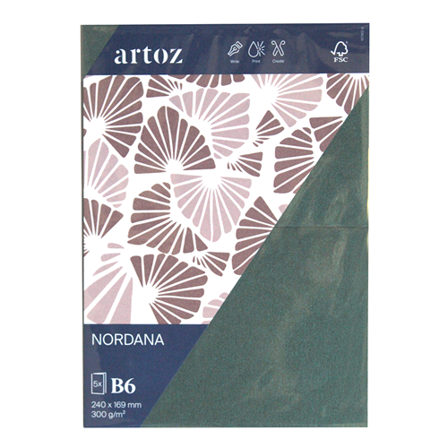 L’élégance nordique s’invite chez vous avec le papier Artoz Nordana. Ses teintes douces et sa brillance subtile confèrent à vos projets une beauté intemporelle. Le papier Nordana se prête à merveille à la réalisation d’invitations festives, de cartes de Noël élégantes et de cartes-cadeaux uniques – pour des souvenirs durables empreints d’un charme délicieusement scandinave. - Papier 100 g/m² - Carton 220 g/m² - Format: B6, carte double verticale, avec rainure de pliage - Set de 5 pièces sous cellophane - 240 × 169 mm - Certifié FSC®